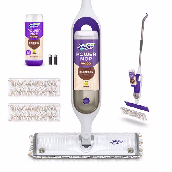 Mop smarter with the Swiffer PowerMop Wood, an all-in-one mopping system so you can clean your floors in minutes*. The mopping pads have hundreds of gentle-glide strips that are safe for hardwood floors** and absorb dirt and grime. The lemon scented QuickDry cleaning formula dries up to 2X faster***. Some assembly required; batteries included.